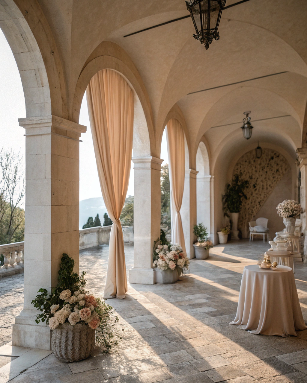 The ceremony takes place in the garden pavilion, framed by centuries-old olive trees and soft natural light. Every detail is designed to honor this sacred moment.